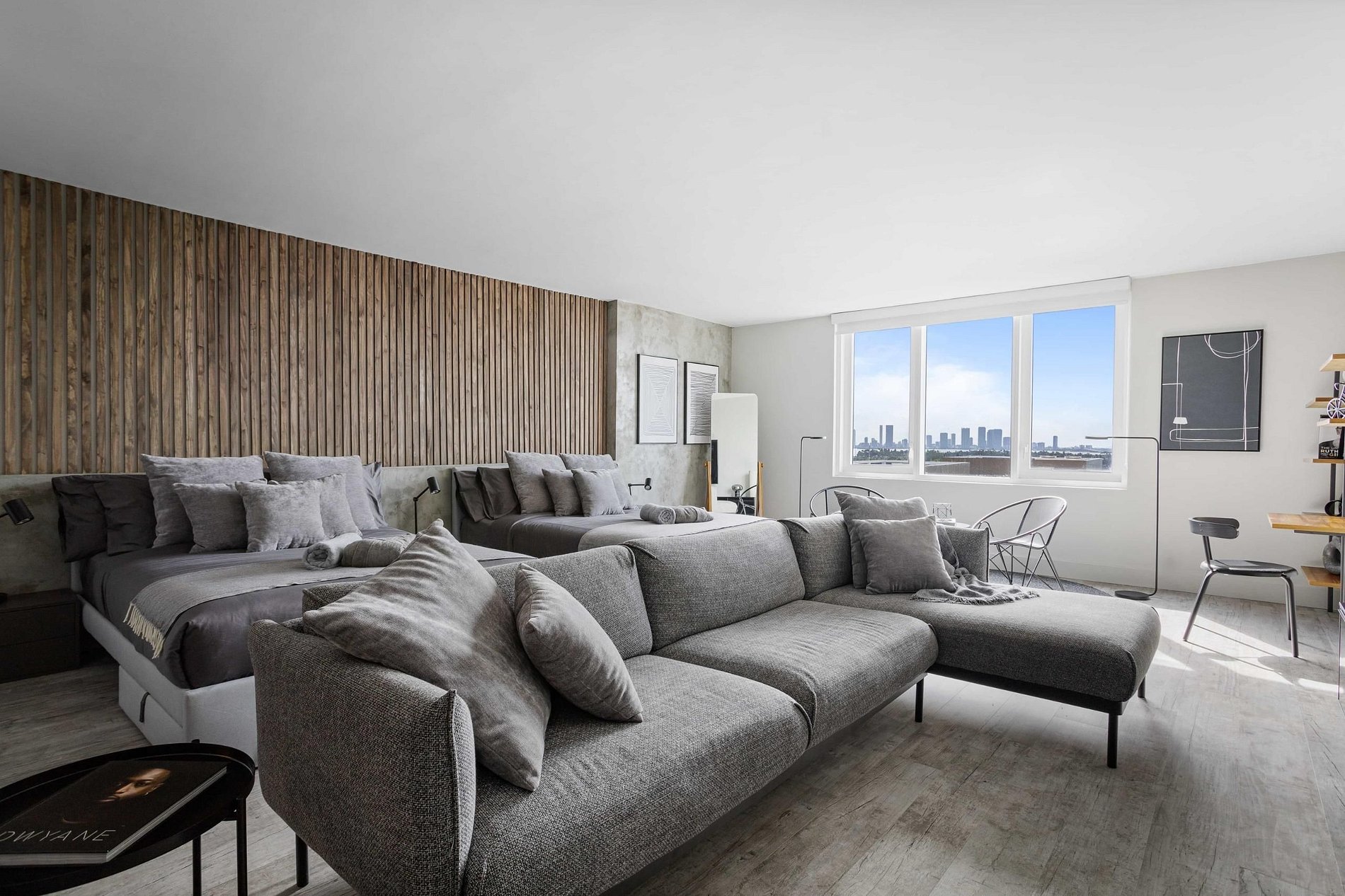 Estudio de lujo con vistas abiertas a la ciudad y la bahía, diseñado para combinar sofisticación y confort. Ofrece dos camas queen, un cómodo sillón y TV para relajarte. La cocina está completamente equipada para preparar cualquier comida, con una mesa de comedor ideal para disfrutar de tus platos. El baño completo cuenta con una moderna ducha para relajarte tras un día en la ciudad. Este estudio es perfecto para quienes buscan un espacio elegante y funcional con vistas espectaculares.